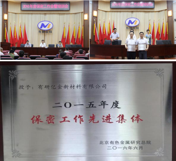 7月5日上午,北京有色金屬研究總院召開了“2016年保密工作會(huì)議暨培訓(xùn)會(huì)”,并頒發(fā)了2015年度保密工作先進(jìn)集體獎(jiǎng)和先進(jìn)個(gè)人獎(jiǎng),有研億金新材料有限公司喜獲“2015年度保密工作先進(jìn)集體”榮譽(yù)稱號(hào)。有研總院黃松濤副院長、科技開發(fā)部常秀敏主任、朱寶宏副主任、各二級(jí)單位和控股公司的全體保密人員參加了大會(huì)。